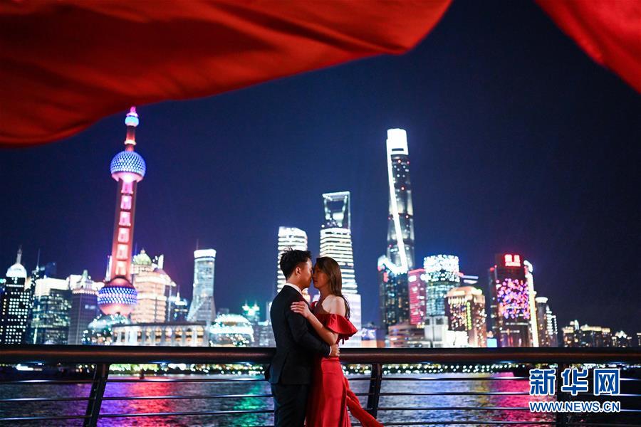 11月1日,一对青年男女在上海外滩拍摄婚纱照。首届中国国际进口博览会即将在上海开幕。美丽的上海张开怀抱,迎接八方来客。 新华社记者 陈晔华 摄