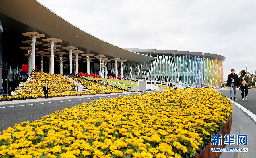 国家会展中心(上海)摆满鲜花(11月2日摄)。首届中国国际进口博览会即将在上海开幕。美丽的上海张开怀抱,迎接八方来客。 新华社记者 方喆 摄