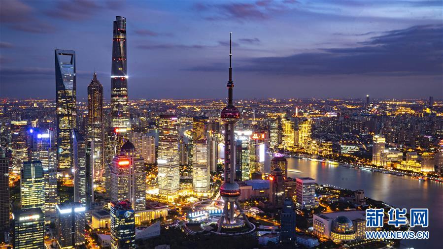 夜色中的上海陆家嘴(6月23日无人机拍摄)。首届中国国际进口博览会即将在上海开幕。美丽的上海张开怀抱,迎接八方来客。 新华社记者 殷刚 摄