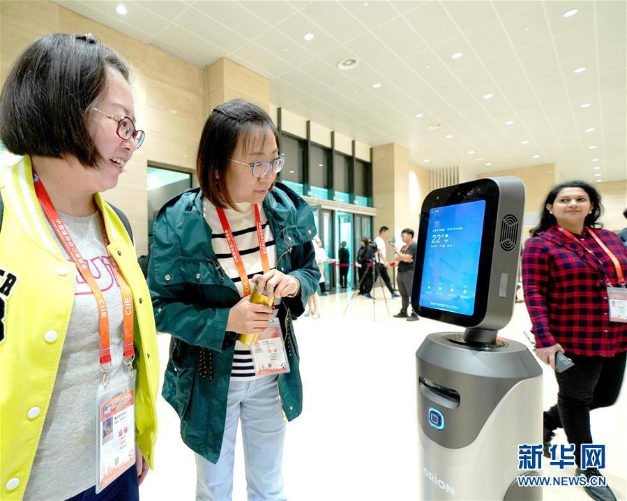 11月4日,媒体记者在首届中国国际进口博览会新闻中心和引导机器人互动。 新华社记者陈建力摄