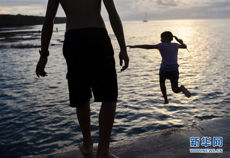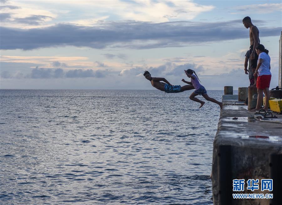10月30日,人们在纽埃阿洛菲的码头玩耍。 新华社记者郭磊摄