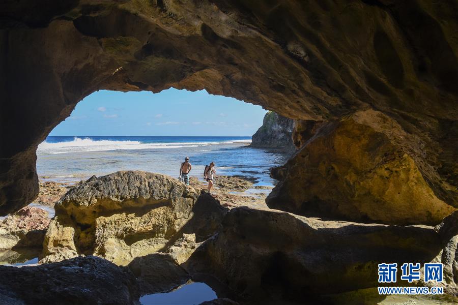 11月2日,两名游客行走在洞穴密布的纽埃海岸。 新华社记者郭磊摄