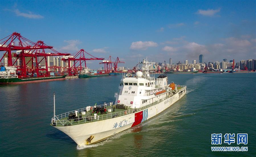 11月3日,“海巡21”轮驶出港口。 当日,随着“海巡21”轮缓缓驶离海口海事监管基地码头,由琼桂粤海事部门共同开展的琼州海峡、北部湾及环海南岛水域跨辖区联合巡航执法活动揭开序幕。 新华社记者杨冠宇摄