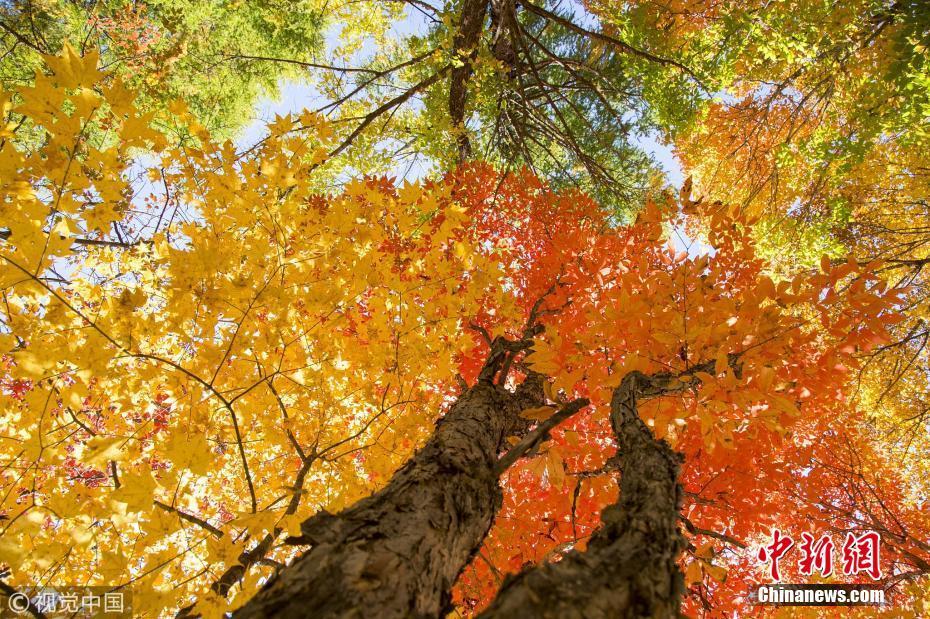 深秋时节,山东济南楔子山山脊两边种植的植被形成“一山双色”景观,令人称奇。