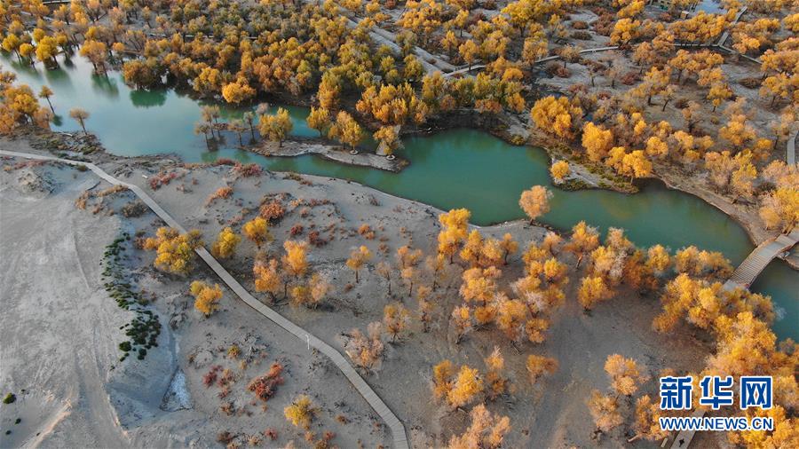 10月中旬以来,新疆天山以南的塔里木河流域胡杨叶片由绿变黄,如同披上了金色外套。 2000年起,塔里木河19次向下游生态输水,累计下泄生态水76.2亿立方米。多年的持续输水结束了塔里木河下游河道连续断流30年的历史,缓解了流域生态退化的被动局面,塔里木河下游动植物物种显著增加、水环境得到有效改善。