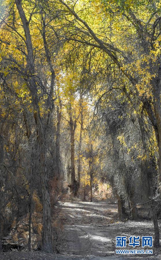 新疆轮台县胡杨林深处的一条小路(10月25日摄)。 10月中下旬,静静的塔里木河中下游一片金黄。胡杨深处,条条小路蜿蜒绵长通向远方,引人入胜。 塔里木河是中国最长的内陆河,这一区域原始胡杨林分布较为集中。随着塔里木河连续19次向下游生态输水,为胡杨林“解渴”,塔河两岸生态得到明显改善,沙地面积逐年减少。 新华社记者赵戈摄