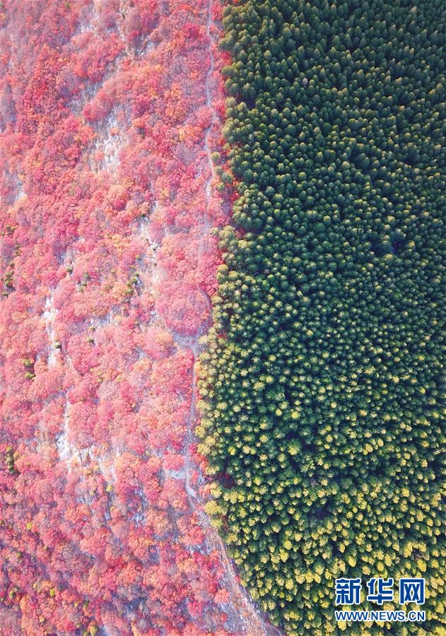 这是山东济南楔子山色彩分明的树林(10月31日无人机拍摄)。 新华社记者朱峥摄