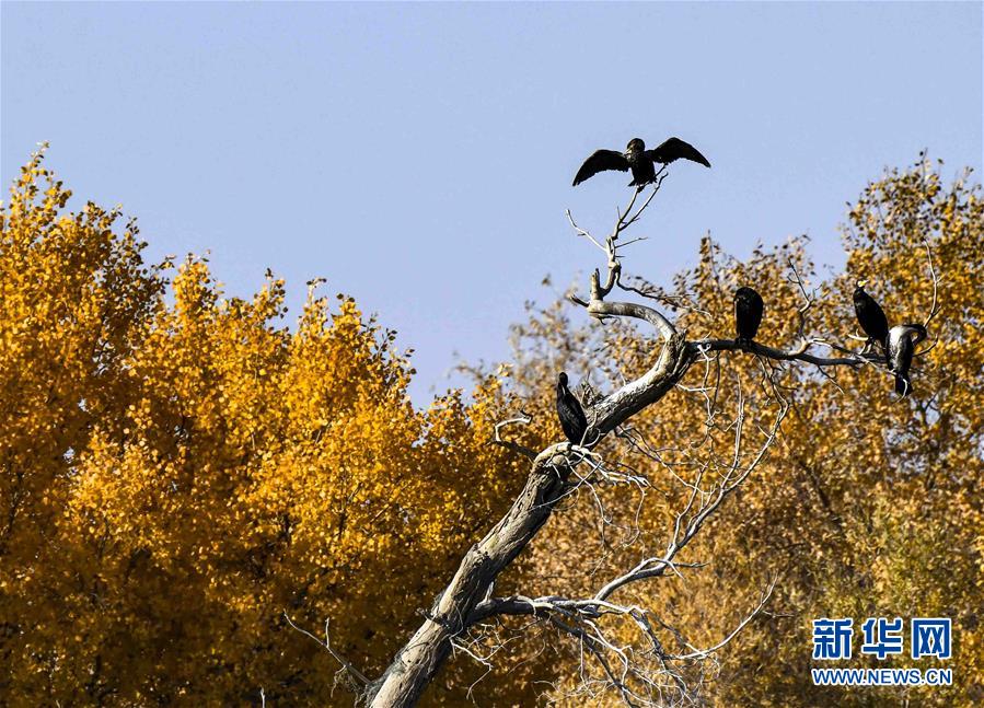 在位于新疆巴音郭楞蒙古自治州轮台县的一处胡杨林里,鸟儿站在胡杨枝头上(10月25日摄)。