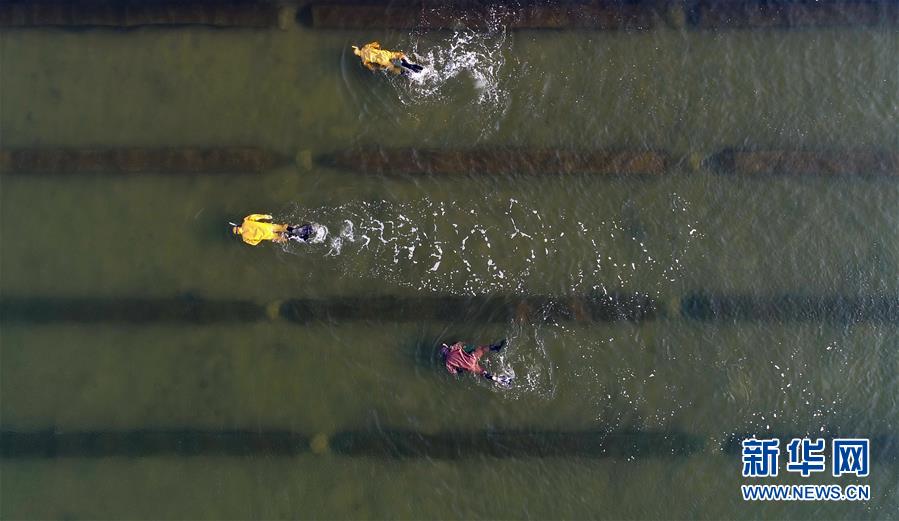 10月22日,乐亭县姜各庄镇二节村海参养殖基地的工人在捕捞海参(无人机拍摄)。 时下,正值渤海湾地区海参收获时节,河北省乐亭县的海参养殖户忙着捕捞海参,供应各地市场。据介绍,该县海域水质优良、气候适宜,是海参养殖的理想场地,目前发展池塘造礁养殖海参面积6万亩,年产鲜活海参6000多吨,年产值2亿多元。  新华社记者 杨世尧 摄