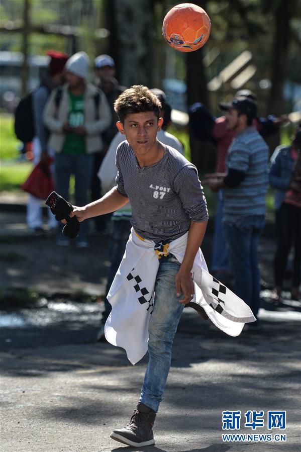 11月5日,在墨西哥首都墨西哥城,一名中美洲移民在临时安置点踢足球。 新华社记者辛悦卫 摄