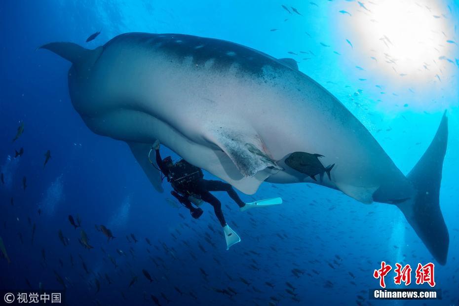 科学家水下与鲸鲨共舞 贴身“体检”提取研究样本
