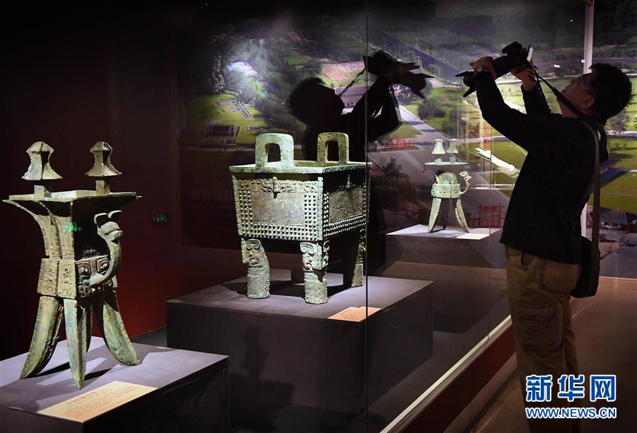 10月12日,参观者在安阳博物馆拍摄展品。目前,“凤归大邑商——殷墟妇好文物安阳故里展”正在安阳博物馆展出,共展出文物474件。1976年被考古学家发现的妇好墓,是世界文化遗产、中国商代后期都城遗址——殷墟唯一保存完整的商代王室墓葬。新华社记者李安摄