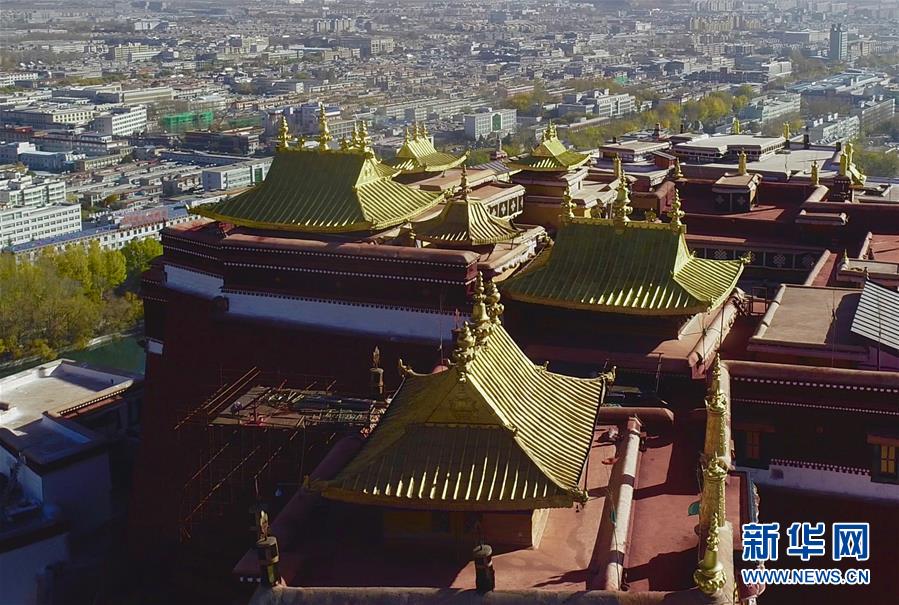 修缮后的布达拉宫金顶群(11月7日无人机拍摄)。