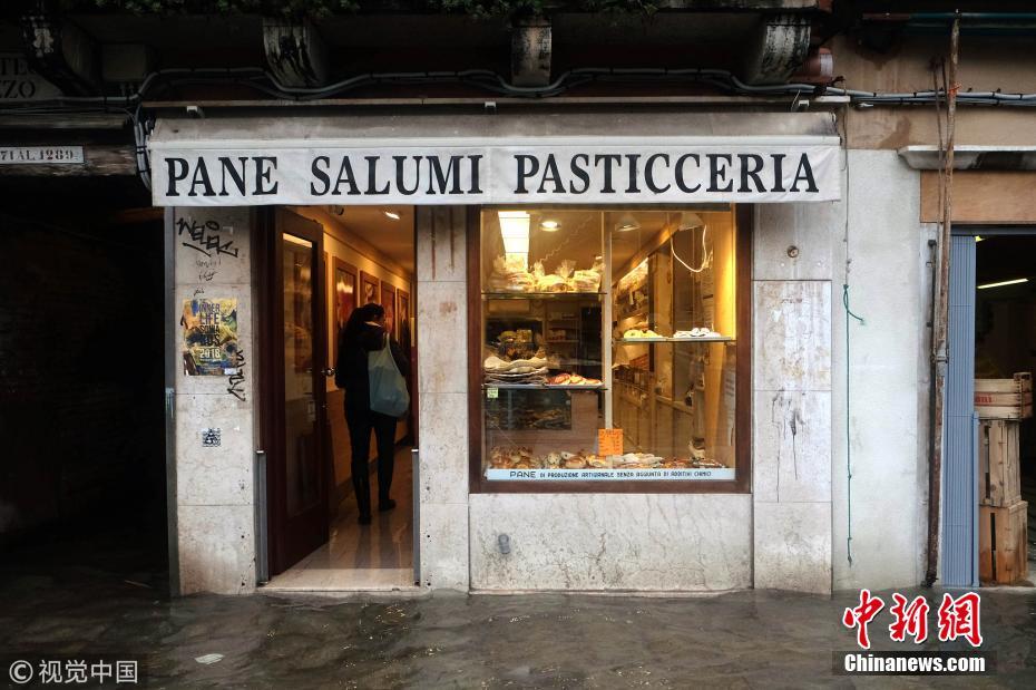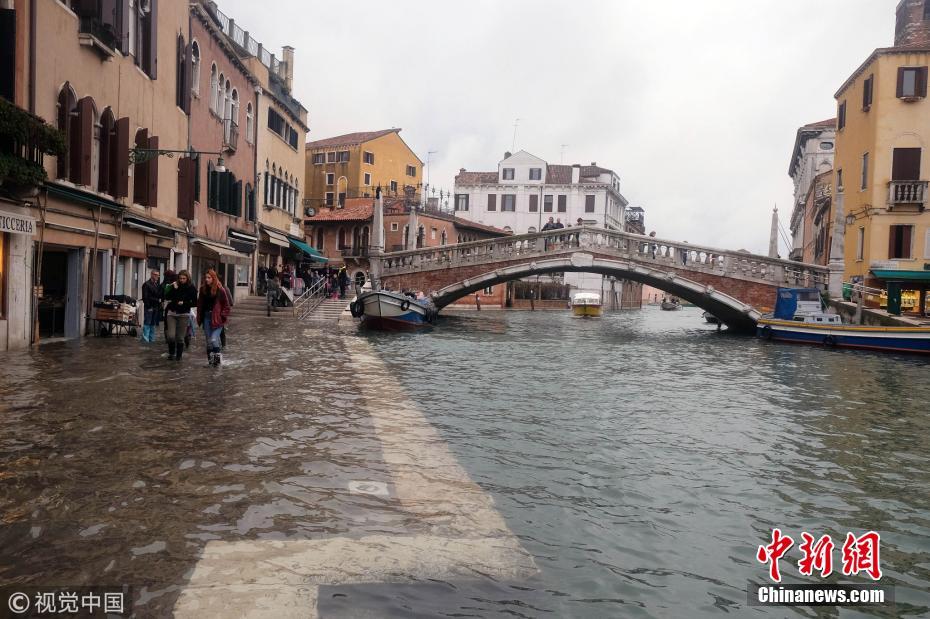当地时间2018年11月5日,意大利威尼斯,过去一周的狂风暴雨使威尼斯古城面临严重的洪灾威胁,当地市民们在被洪水淹没的街道上艰难前进。 图片来源:视觉中国