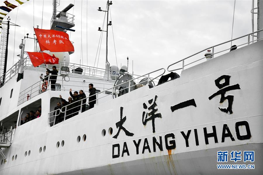 11月7日,科考队员在“大洋一号”上向前来迎接的人群挥手致意。 新华社记者 李紫恒 摄