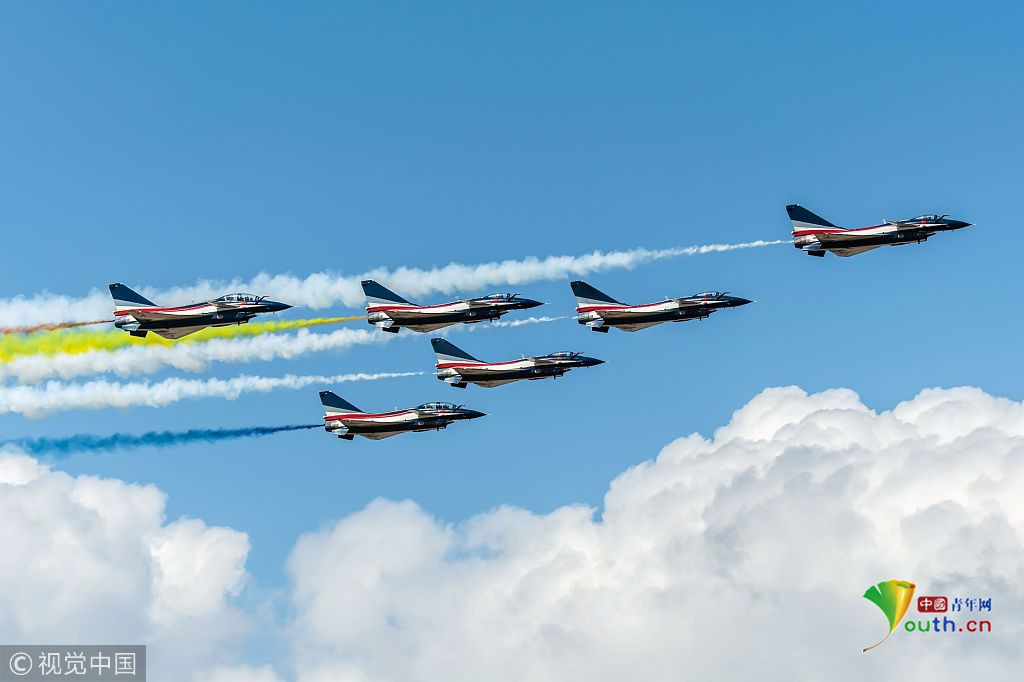 图三:2018年11月6日,广东珠海航展上,八一飞行表演队驾驶着歼-10A飞机划过天空。