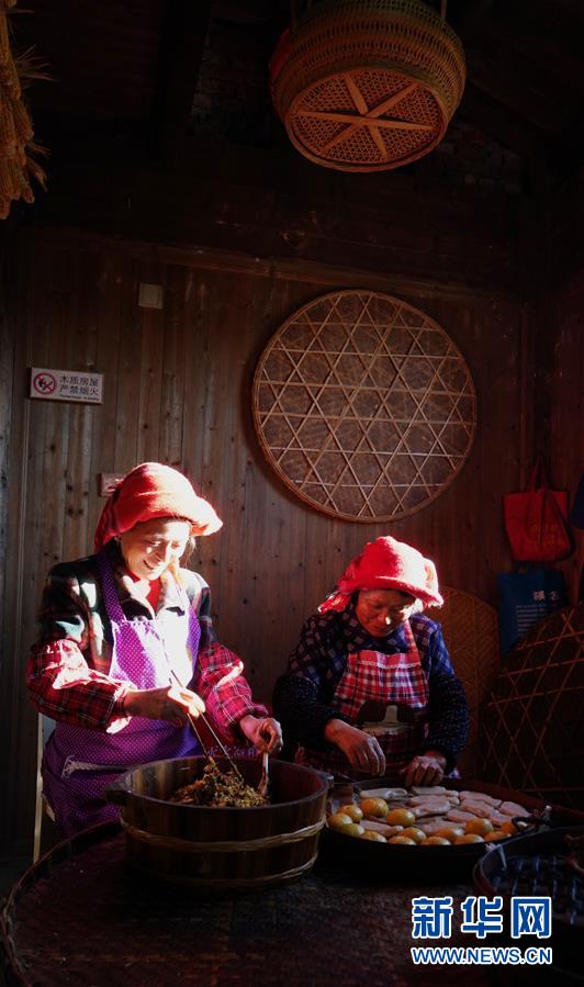 11月9月,江春花(左)和同事在婺源县篁岭景区制作玉米糕。新华社记者 胡晨欢 摄