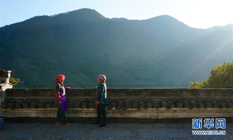 11月9日,江春花(左)在婺源县篁岭景区和同事在工作之余聊天。新华社记者 胡晨欢 摄