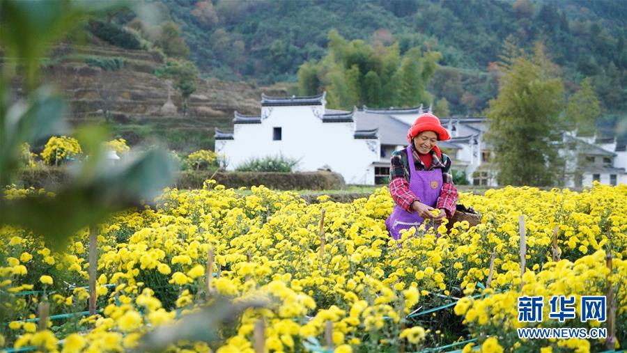 11月9日,江春花在婺源县篁岭村自家门前采摘皇菊。新华社记者 胡晨欢 摄