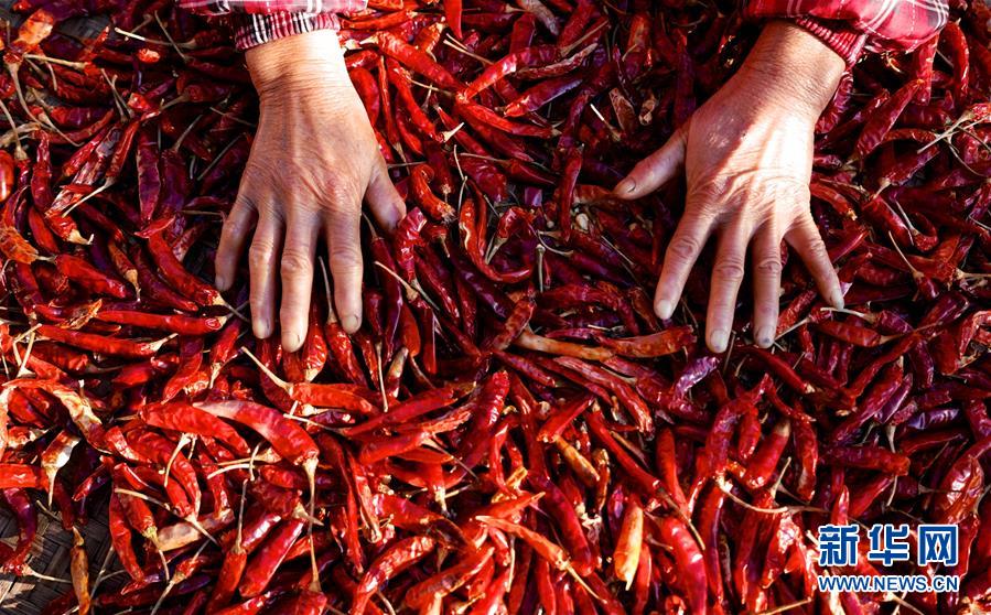 11月9日,江春花在婺源县篁岭景区挑选辣椒。新华社记者 胡晨欢 摄
