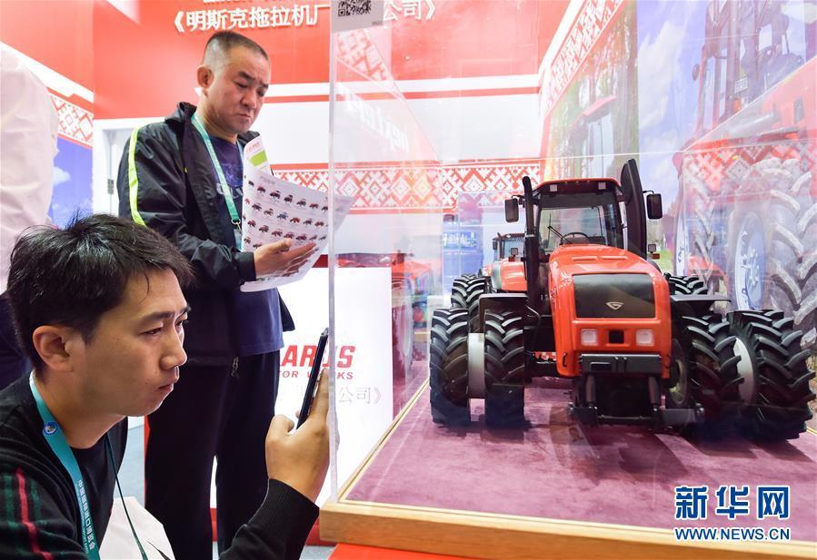 11月7日,参观者在拍摄、观看白俄罗斯明斯克拖拉机厂的拖拉机模型。 新华社记者 李贺 摄