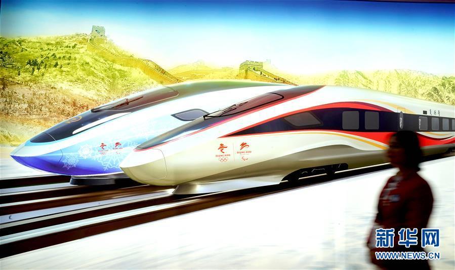 11月8日,一位志愿者从进博会中国馆一幅高铁概念图前走过。 新华社记者 陈建力 摄