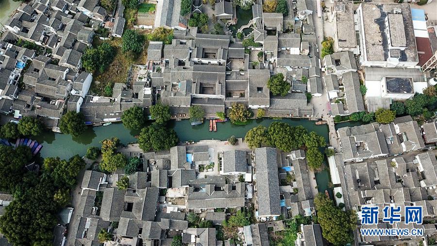 苏州市吴江区七都镇开弦弓村村貌(10月23日无人机拍摄)。近年来,开弦弓村形成了化纤纺织、针织衫编织和水产养殖三大产业,2017年村集体收入268万元,农民人均可支配收入3万多元。