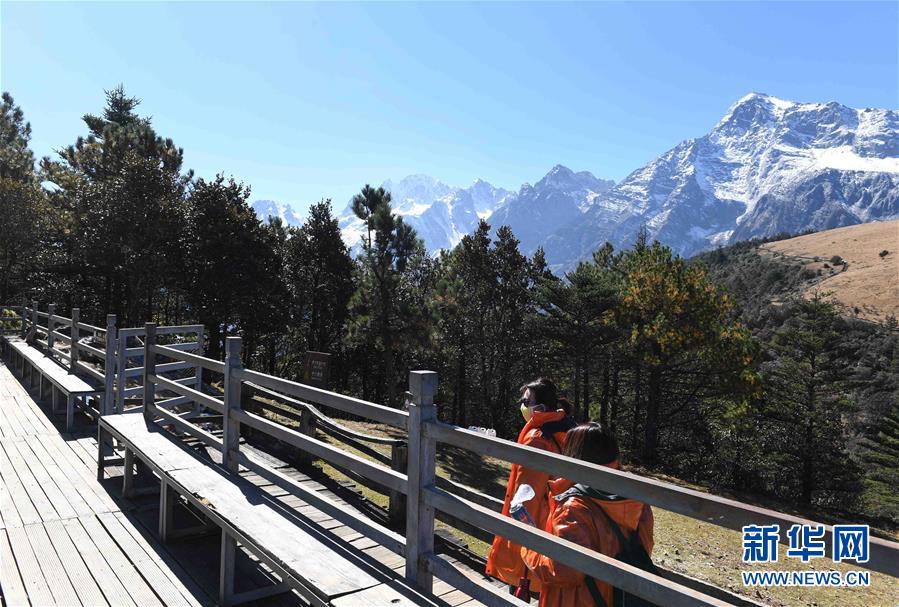 初冬的云南省丽江玉龙雪山景色秀美,吸引游客前来观光。