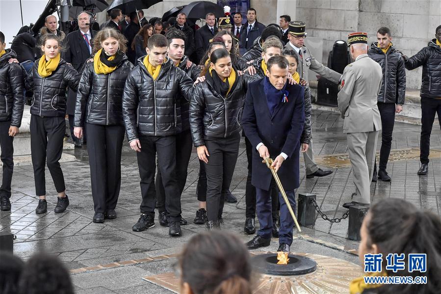 11月11日,在法国巴黎,法国总统马克龙在纪念仪式上拨旺无名烈士墓的火焰。当日,法国政府在巴黎凯旋门前举行仪式,隆重纪念第一次世界大战结束一百周年。新华社记者 陈益宸 摄