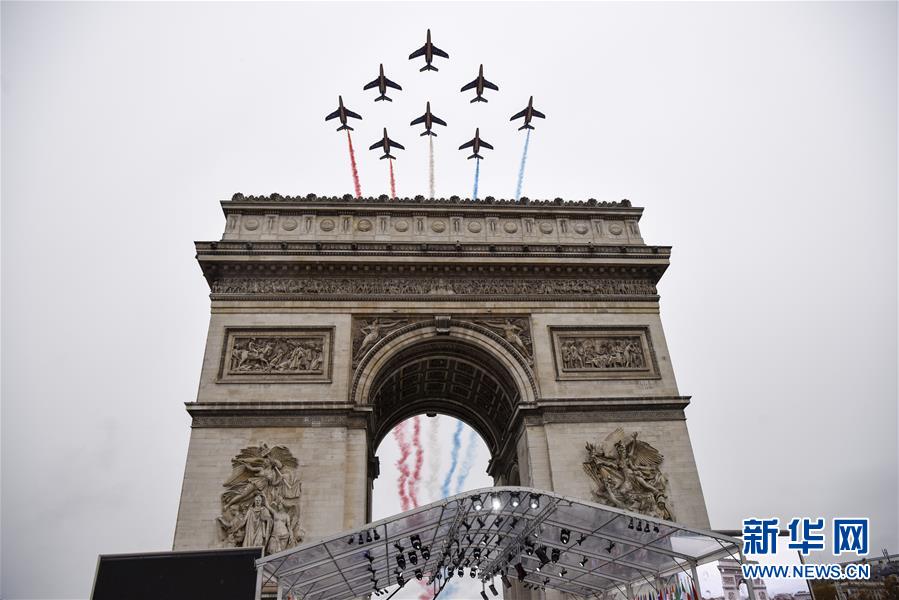 11月11日,在法国巴黎,“法兰西巡逻兵”飞行表演队在纪念仪式上飞过凯旋门。当日,法国政府在巴黎凯旋门前举行仪式,隆重纪念第一次世界大战结束一百周年。新华社记者 陈益宸 摄