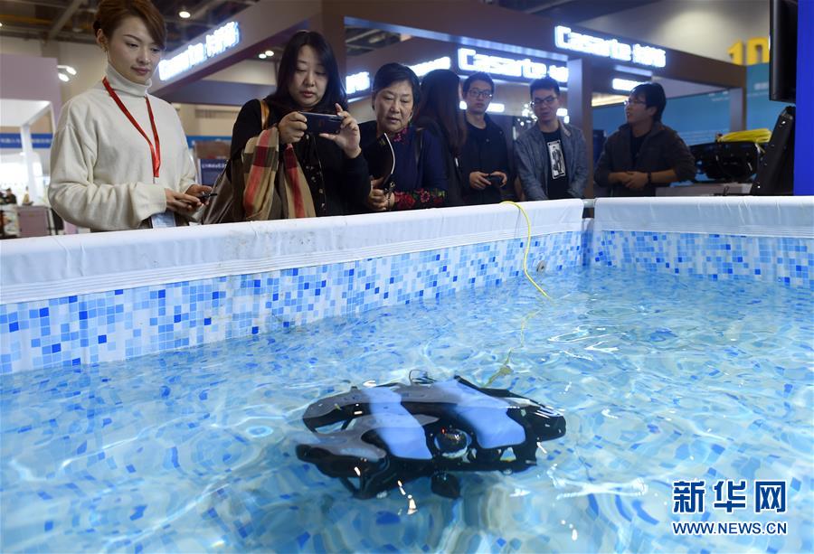 11月10日,人们在展会现场观看展出的一款小型水下机器人。 新华社记者韩传号摄