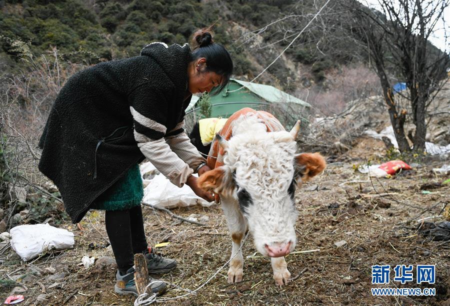 在西藏昌都市江达县波罗乡境内的康扎西安置点内,群众在喂养小牛犊(11月11日摄)。 西藏自治区江达县波罗乡康扎西安置点,离波罗乡政府直线距离约3公里,位于一处地势开阔平缓的山谷中,比堰塞湖水面高出100多米。10月11日金沙江白格段山体滑坡发生后,当地就在这里设立了安置点,安置附近受灾群众。 新华社记者 刘东君 摄