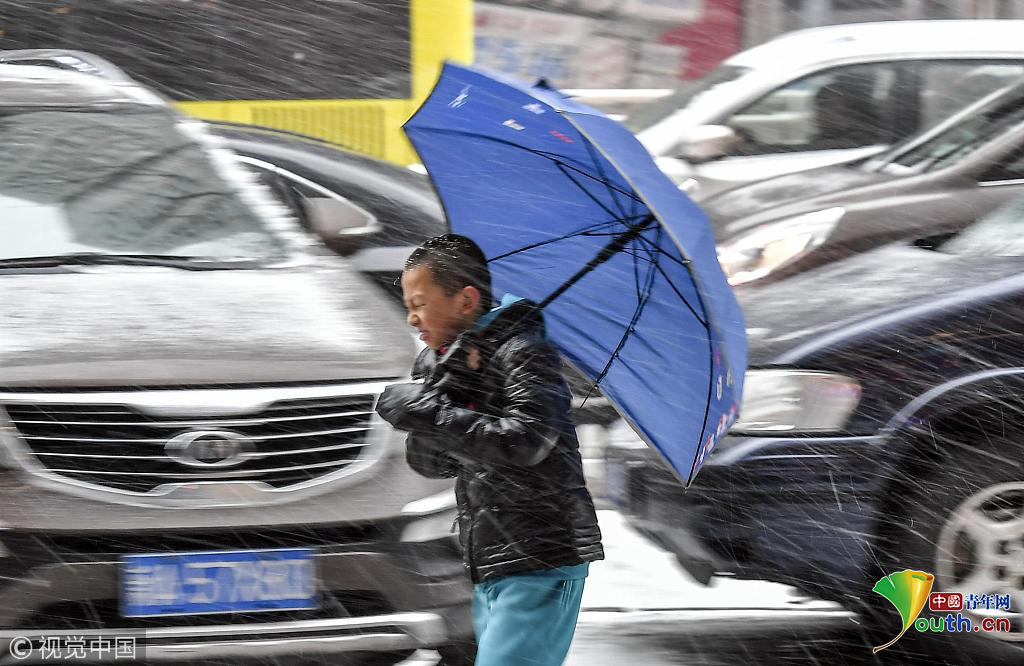 2018年11月12日,持续浓雾天气的新疆乌鲁木齐市,又迎来一场雨雪天气,气温随之骤降。图为一名男孩打着雨伞与风雪“抗争”。图片作者:刘新