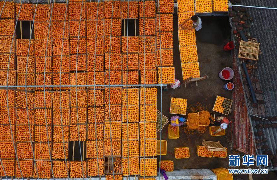 10月17日,广西桂林市平乐县沙子镇渡河村农民在晾晒柿子(无人机拍摄)。 金秋时节,农民们忙着收获成熟的农作物,喜迎丰收。 新华社记者 黄孝邦 摄