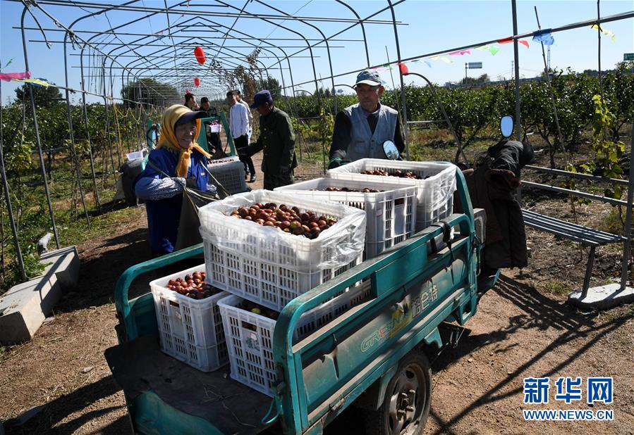10月17日,在山东省青岛市即墨区蓝村镇王演庄北村,种植户在果园里收集采摘的大枣。 金秋时节,农民们忙着收获成熟的农作物,喜迎丰收。 新华社记者 李紫恒摄