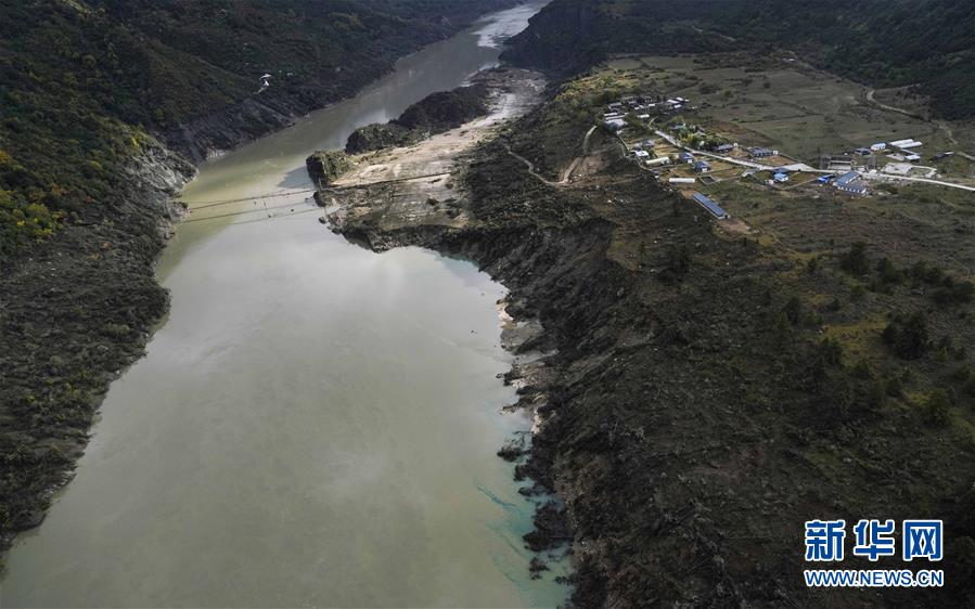 10月20日拍摄的西藏雅鲁藏布江米林县堰塞湖自然过流后的加拉村。 10月19日13时30分,西藏雅鲁藏布江米林县堰塞湖开始自然过流。记者从应急管理部牵头的联合工作组获悉,截至20日7时,雅鲁藏布江堰塞湖坝前水位已下降56米,估算留存水量1.6亿立方米,堰塞湖洪水威胁得到缓解,防洪安全风险大大减轻,并将继续降低。 10月20日,记者乘坐直升机从空中拍摄了雅鲁藏布江堰塞湖自然过流的画面。 新华社记者普布扎西摄