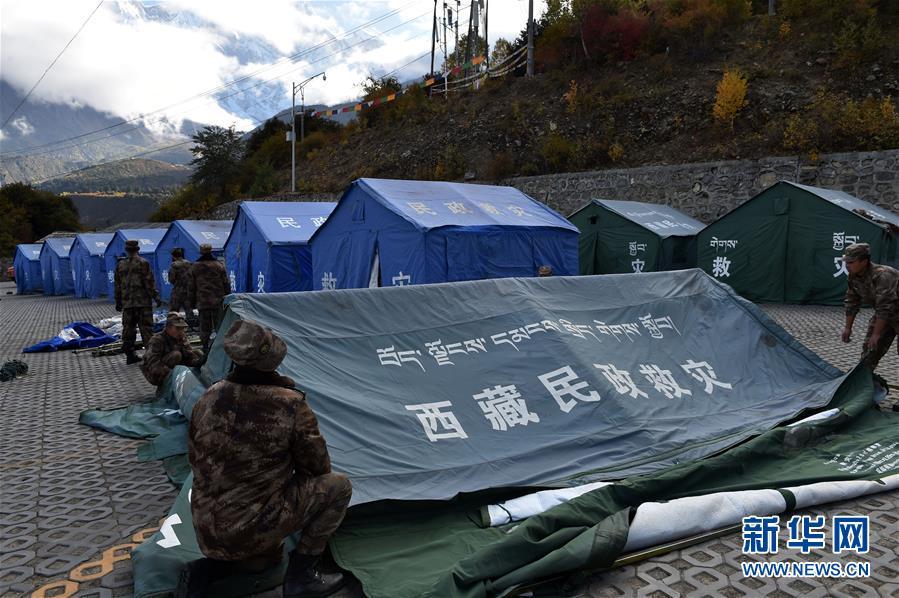 10月19日,救援人员在米林县派镇尼定村搭建安置点。 记者从西藏自治区林芝加拉村雅鲁藏布江堰塞湖灾情应急抢险工作第二场新闻发布会上获悉,19日13时30分,雅鲁藏布江米林县堰塞体上游水位超过堰塞体,开始自然过流,上游水位正在缓慢下降。目前,各项抢险救援工作正在有序开展。 新华社记者 觉果 摄