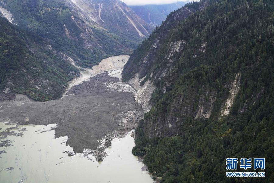 空中俯瞰堰塞湖和堰塞体(10月18日摄)。