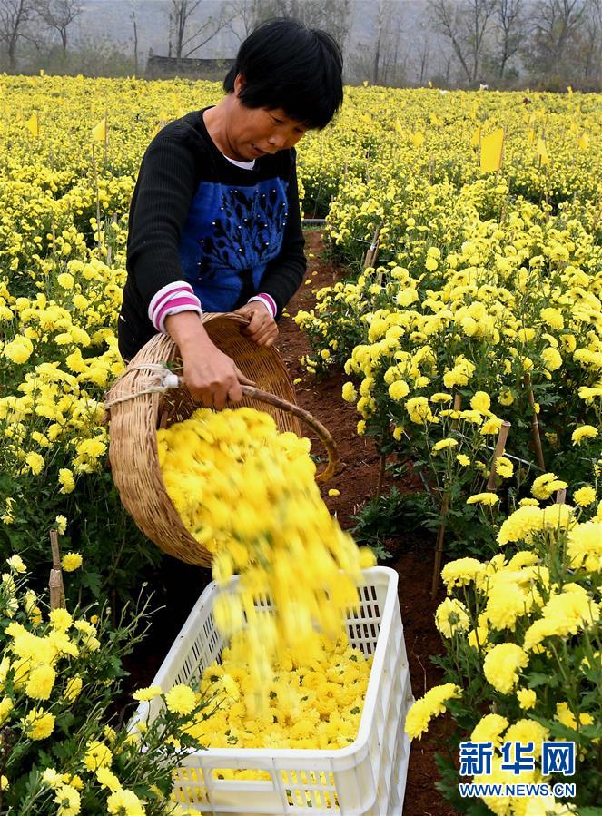 11月14日,在河南省内乡县乍曲镇水沟村千亩郦邑贡菊基地,农户将采摘的菊花装筐。 近年来,河南省内乡县依托资源优势,把发展特色农业作为精准扶贫的重要举措,采取“公司+合作社+农户”的方式,招引农业龙头企业发展菊花种植产业,把菊花加工成茶饮、药材等高附加值产品,累计带动150余户贫困户就业增收。 新华社记者 李安 摄