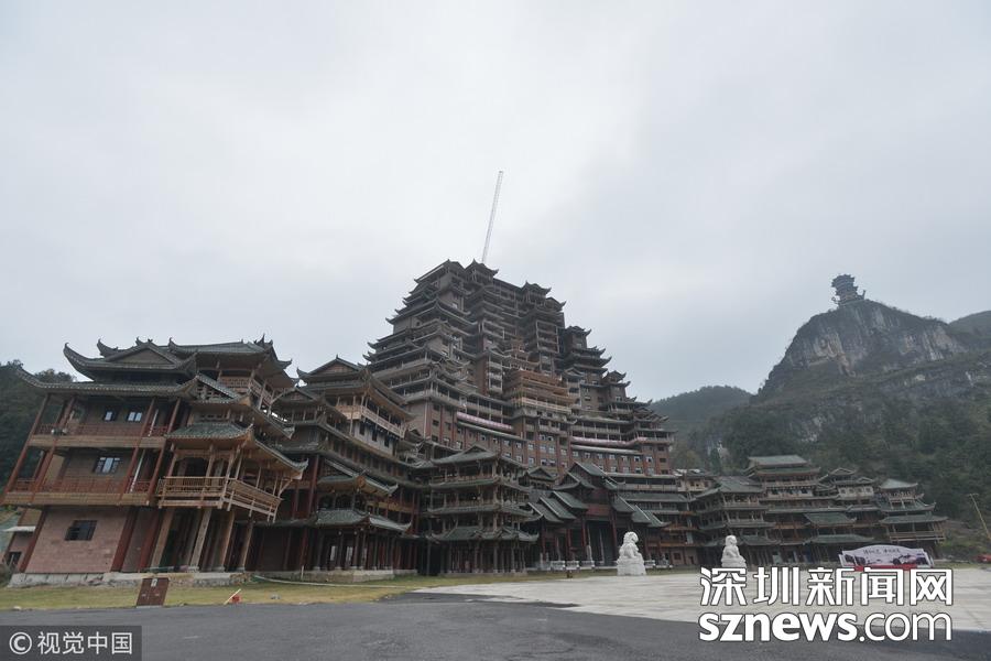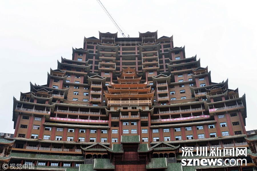 深圳新网网讯 始建于2016年9月的贵州省独山县水司楼已进入工程收尾阶段。雄伟壮丽造型别致的水司楼,是集会展博览、酒店住宿、游览观光等于一体的大型综合体。除具有水族特色元素外,该建筑还融合了苗族、布依族特色,是独山县净心谷景区最具标志性的宏大建筑。该楼占地面积5900平方米,总建筑面积60000平方米,楼高99.9米,共24层,是世界上最高大最大最壮观的水族建筑,被称为“天下第一水司楼”。 水司楼是按照水族依山畔水而居的传统习俗和建筑特征修建,是水族人民的文化符号和智慧的象征,背靠净心河谷山脊,以弧形的平面布局模式,如同张开怀抱的巨人,紧拥美丽的姻脂河湾,设计巧妙,工艺精巧。