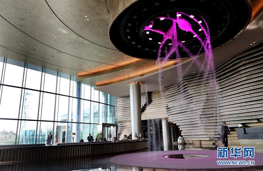 这是世茂洲际酒店大堂内的水幕装置(11月13日摄)。 位于上海松江的世茂洲际酒店11月15日正式开门营业。这家在一个废弃采石矿坑内建成的酒店成为上海又一新景。 新华社记者 方喆 摄