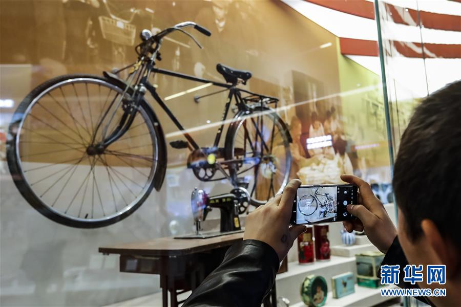 11月15日,在“历史巨变”展区,一名参观者在拍摄老式自行车和缝纫机。