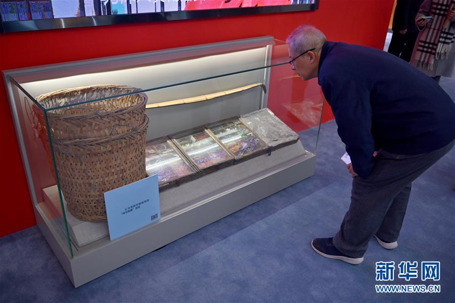 11月15日,一名参观者在“历史巨变”展区观看义乌货郎早期使用的“鸡毛换糖”货担。