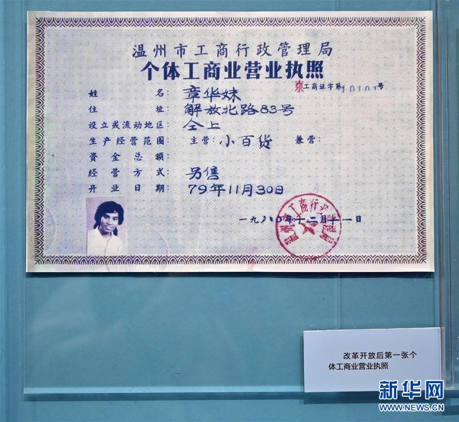 这是在“历史巨变”展区拍摄的改革开放后第一张个体工商业营业执照(11月15日摄)。