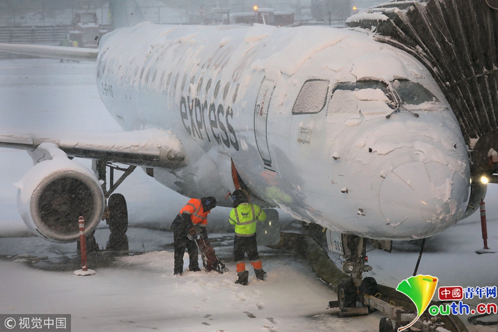 当地时间2018年11月15日,美国新泽西州纽瓦克,纽瓦克国际机场大量航班因暴风雪停飞。
