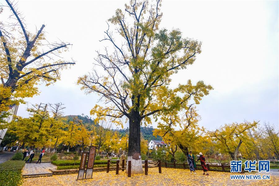 11月16日,游客在银杏林中游玩。近日,在浙江省长兴县小浦镇,“十里银杏长廊”和近千亩花海经过近一年的升级改造后,以崭新的面貌与游客见面。花海、观光小火车、古村民宿、银杏长廊等旅游项目全面提升了小浦镇乡村旅游的品质。新华社记者 徐昱 摄