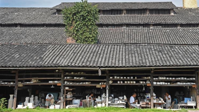 在江西景德镇御窑厂遗址附近的一处老窑厂内,工匠们正在制作瓷器(9月20日摄)。