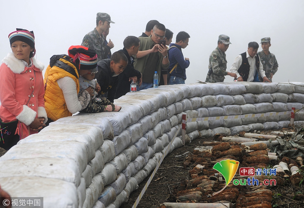 2018年11月16日,云南省麻栗坡县猛硐瑶族乡村民在老山西侧坝子雷场参观搜排出的地雷和爆炸物。图片作者:彭希/视觉中国
