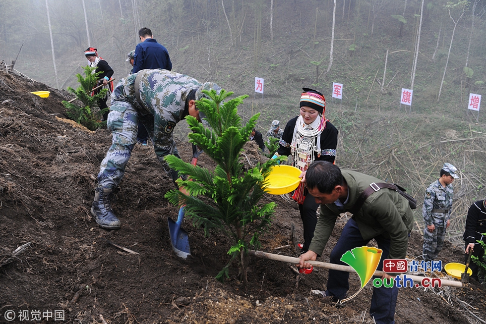 2018年11月16日,南部战区陆军云南扫雷大队官兵和云南省麻栗坡县猛硐瑶族乡村民共同种下南洋杉。