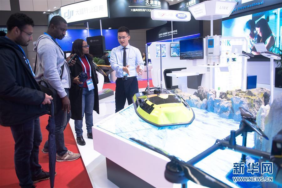 11月18日,展商向参观者介绍一款智能无人测量船。当日,首届联合国世界地理信息大会技术与应用展览在浙江省德清县开幕。200余家国内外展商参展,综合展示地理信息、卫星导航、航空航天遥感等领域的领先技术和应用。新华社记者 翁忻旸 摄
